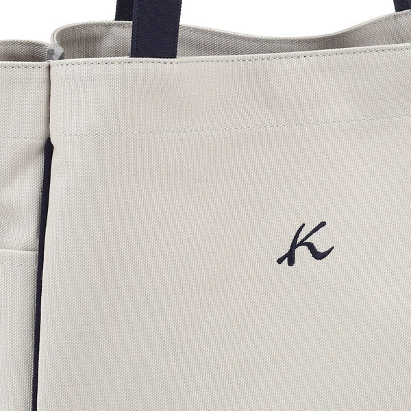 キャンバス素材のセミショルダーバッグ。シンプルなデザインに、Kマーク刺繍がワンポイント。内側には大きめの吊りポケットが付いているので、鍵やスマホなど小物の収納に便利。吊りポケットは目隠しフラップにもなり、間口を広げて使いたいときに中身が見えにくく安心です。外側にはサイドポケット2つ、背面側にも2つと収納スペースも充実。A4バインダーやペットボトルもしっかり収まるので、普段使いはもちろん、お仕事や習い事など、幅広いシーンにおすすめです。