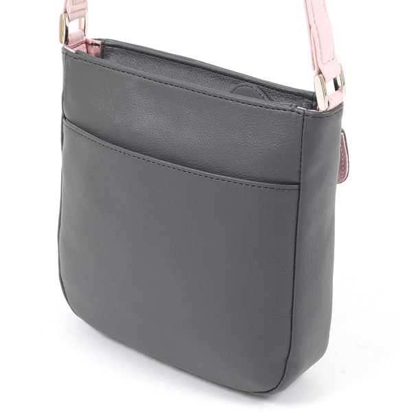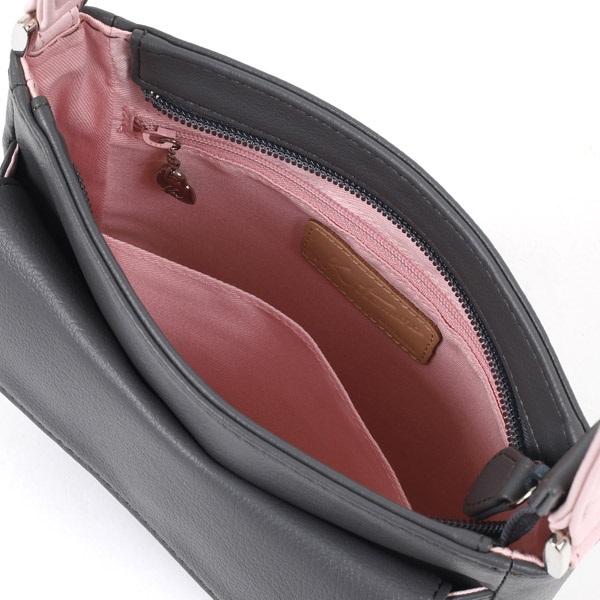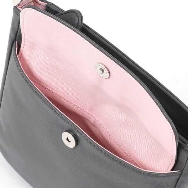 さり気ないK刺繍がワンポイントのショルダーバッグ。コンパクトに荷物を持ち運びたい方におすすめの小ぶりなサイズ感です。前面にマグネットタイプのかぶせポケット、背面にオープンポケットが付いており、小さいながらも収納スペースが充実しています。