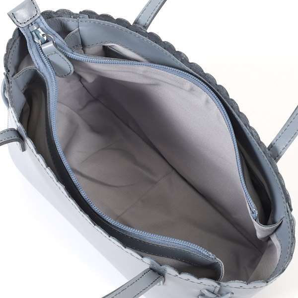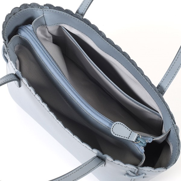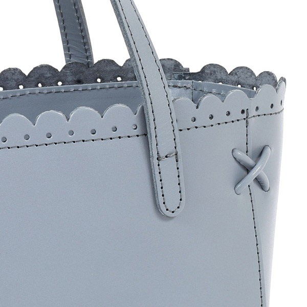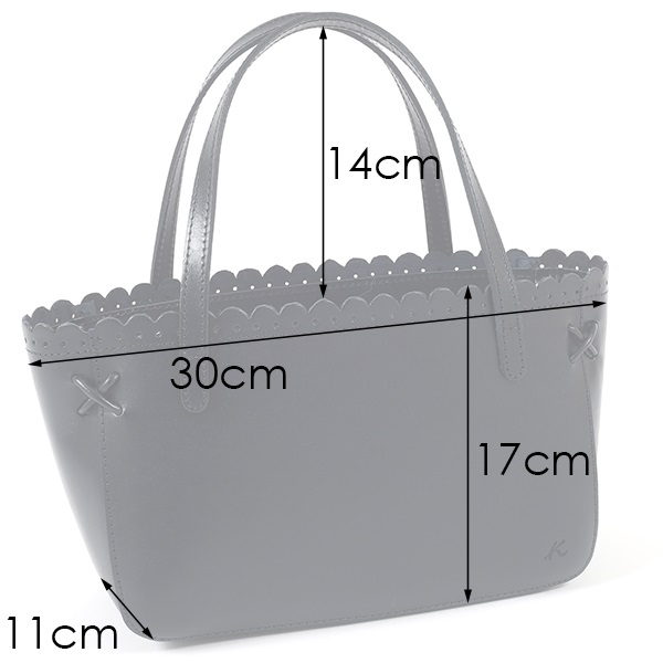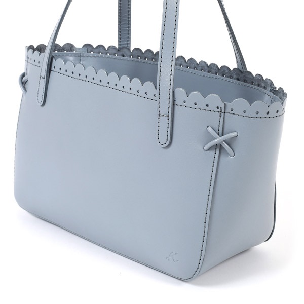 口元に施した細やかなスカラップカットが上品なハンドバッグ。横長シルエットが特徴的なデザインです。角には繊細な飾り紐のクロスステッチをあしらい、華奢な手紐で上品に仕上げました。ほどよいツヤ感のあるスムース牛革がきちんと感を演出。オケージョンからおでかけまで幅広いシーンでお使いいただけます。