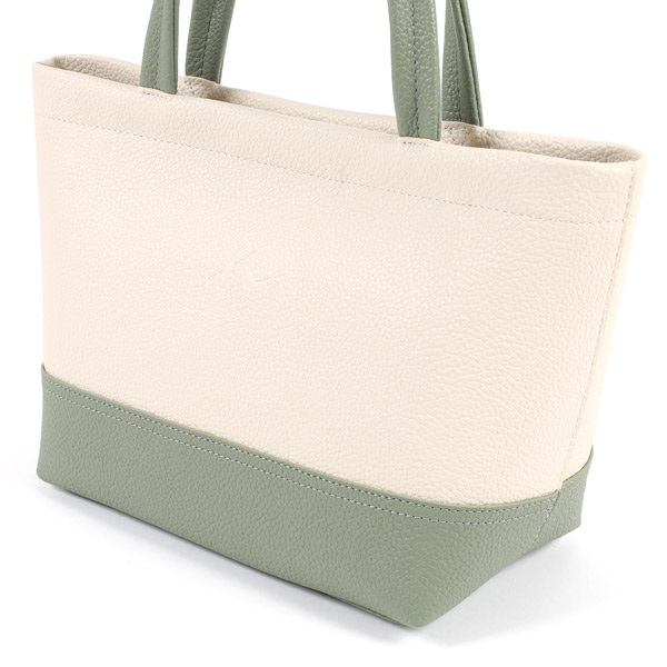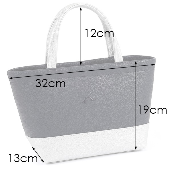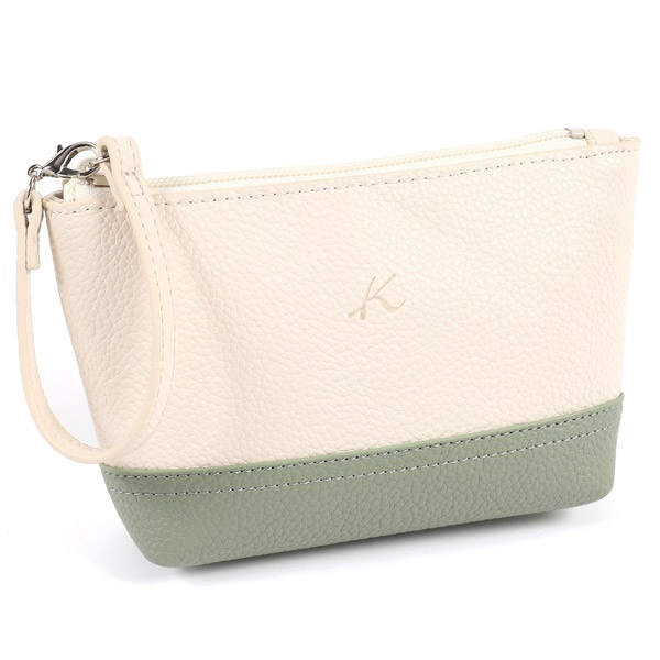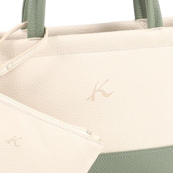 カラーコンビがアクセントのハンドバッグ。同デザインのポーチが付属し、取り外しも可能です。小ぶりですが長財布や折りたたみ傘をゆったり収納できるサイズ感で、内装には細かい物の収納に便利なポケット付き。前側にさり気なくKマーク素押しをあしらいました。合皮素材なので、雨の日も気兼ねなくお使いいただけます。