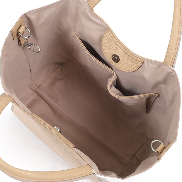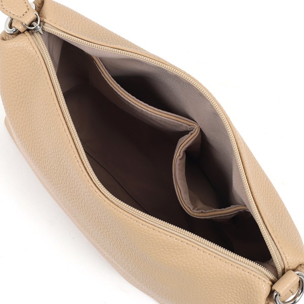 合皮素材のシンプルなセミショルダーバッグ。口元に少しアールを付け、肩に掛けたときのフィット感をアップしました。A4クリアファイルが横にぴったり入るサイズ感。左右のマチを内側に織り込むとフォルムの違いが楽しめます。同素材のショルダーバッグ、パスケースが付属し、オンからオフまで幅広くお使いいただけます。同型で一回り小さいサイズ(Z-0556)もございます。