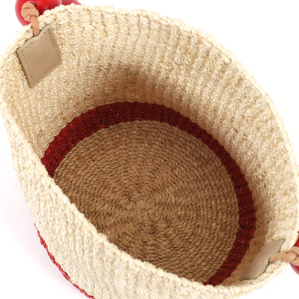 木玉を連ねた持ち手のデザインが印象的なハンドバッグ。軽量で耐久性が高く、環境に優しい天然草木のアバカを使用しています。涼しげでナチュラルな風合いがコーディネートに季節感をプラス。インナーバッグとなる付属の巾着は取り外し可能で、巾着紐にも木玉をあしらっています。