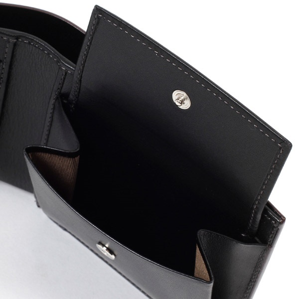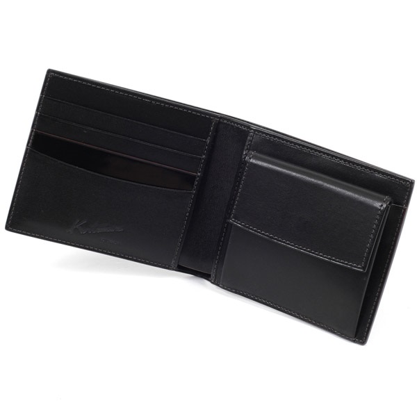 発色の美しいイタリア製コードバンを使用した二折財布。きめが細かく高級感のある表面感と、耐久性に優れ型崩れしにくいのが特徴です。表面を美しく仕上げるためグレージングを施し、上品なツヤを演出しました。また、内部にしっかりオイルを浸透させ、折り曲げに対する耐久性を高めています。内側には耐久性がありキズに強い牛革を使用。小さいバッグでもかさばらないスリムなデザインもポイントです。