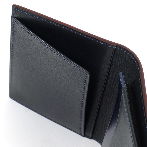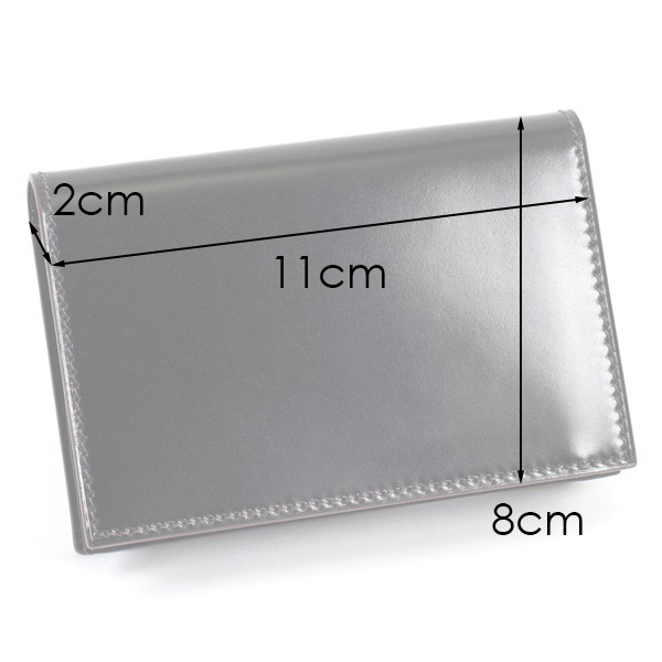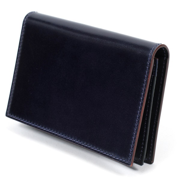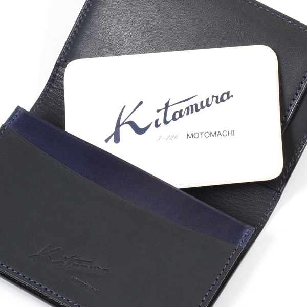 発色の美しいイタリア製コードバンを使用した名刺入れ。内側にKitamura素押しを施し、外側はマークレスですっきりと仕上げました。きめが細かく高級感のある表面感と、耐久性に優れ型崩れしにくいのが特徴。表面を美しく仕上げるためグレージングを施し、上品なツヤを演出しました。また、内部にしっかりオイルを浸透させ、折り曲げに対する耐久性を高めています。内側には耐久性がありキズに強い牛革を使用。かぶせ裏のカードスリットは、名刺を整理して円滑な名刺交換を実現できます。